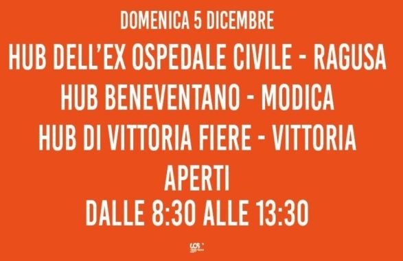 Domenica 5 dicembre 2021 gli hub di Ragusa, ex ospedale Civile; Modica, contrada Beneventano e Vittoria, Fiere, resteranno aperti dalle ore 8:30 alle 13:30. L’apertura degli hub di domani, domenica, servirà agli utenti, che durante la settimana non possono recarsi agli hub, per effettuare il vaccino.