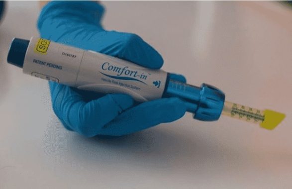 La tecnologia consiste in un getto ad alta velocità che sostituisce completamente l’utilizzo dell’ago, quindi della tradizionale puntura, e garantisce un totale assorbimento del vaccino per via intramuscolare. Il dispositivo medico Comfort-in, certificato Ce, è ideato per somministrazioni sub-cutanee o intramuscolari di sostanze medicamentose. La semplicità e l’assoluta sicurezza lo rendono ideale per ogni tipo di infusione con importanti vantaggi per il paziente, soprattutto per coloro che soffrono di agofobia.