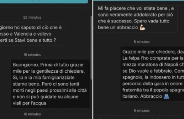 Come detto il cittadino di Valencia aveva acquistato tramite Vinted, la popolare piattaforma per acquistare e vendere abbigliamento usato, una maglietta del Napoli da un ragazzo napoletano. Il venditore, dopo le terribili devastazioni causate dal maltempo a Valencia, si è preoccupato e ha scritto all’acquirente: “Ho saputo di ciò che è successo a Valencia e volevo chiederti se stavi bene”.
