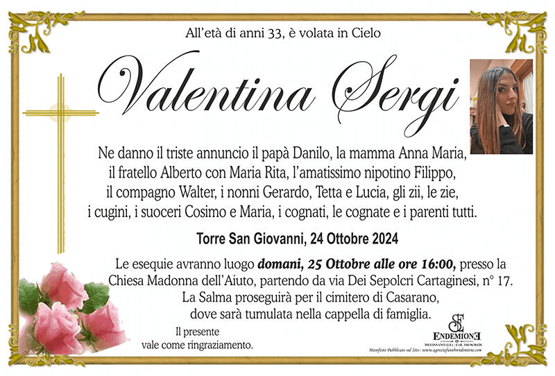 “Era difficile non volerti bene. Bella, solare… il tuo sorriso era contagioso e vogliamo ricordarti così… ci mancherai! Ciao Vale. RIP”. E’ il dolore sintetizzato in un post sui social dalla Astra Volley, la società di Presicce-Acquarica, in provincia di Lecce, che adesso piange Valentina Sergi.