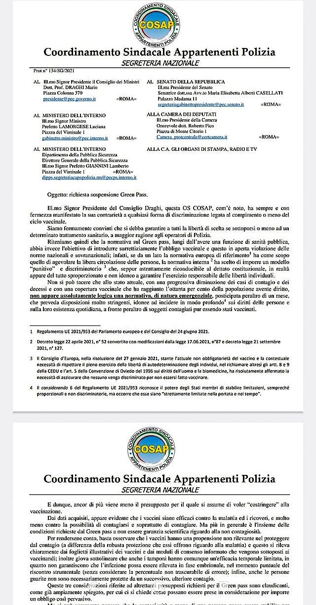 “E io ho riconosciuto migliaia e migliaia di persone di grandissimo valore e, oggi, in particolare, voglio ringraziare il sindacato di Polizia COSAP, in prima linea in difesa della Costituzione e, dunque, come me contrario al lasciapassare verde. Un grazie di cuore particolare al segretario generale Sergio Scalzo per il sostegno, la fiducia e le grandi cose che insieme speriamo di realizzare per il bene di tutti! In data odierna, sono stata nominata dalla segreteria nazionale COSAP all’unanimità dirigente sindacale nazionale per le pari opportunità. E a tutti i poliziotti che la pensano come me, l’invito a unirvi al COSAP, l’unico sindacato che ha avuto il coraggio di starmi accanto e non mi ha abbandonato nel momento del bisogno. Un sindacato vero, a difesa dei lavoratori!”, conclude invitando gli agenti a unirsi “all’unico sindacato che ha avuto il coraggio di starmi accanto” e tagliando fuori, quindi, Sap (Sindacato Autonomo di Polizia) Siap (Sindacato Italiano Appartenenti Polizia) e Siulp (Sindacato Italiano Unitario Lavoratori Polizia).