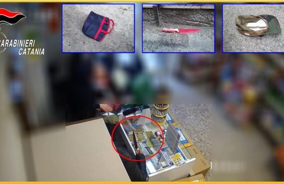 Gli investigatori dell’Arma, intervenuti immediatamente sul posto, ricostruendo le fasi della rapina, anche grazie alle immagini registrate dal sistema di video sorveglianza, rinvennero in via Delle Cave un cappellino verde e bianco, una borsa di plastica di colore bleu e rossa, un coltello con la lama rossa, nonché, in piazza Risorgimento, a circa 300 metri di distanza dall’esercizio commerciale, un giubbotto di pelle nero e uno scaldacollo di colore bleu, il tutto perfettamente corrispondente con quanto indossato e impugnato dall’uomo nel corso del fatto reato.