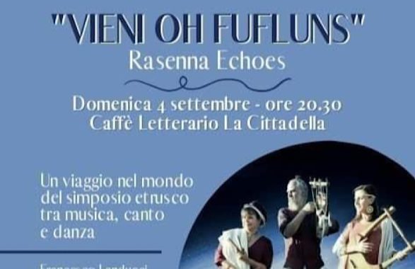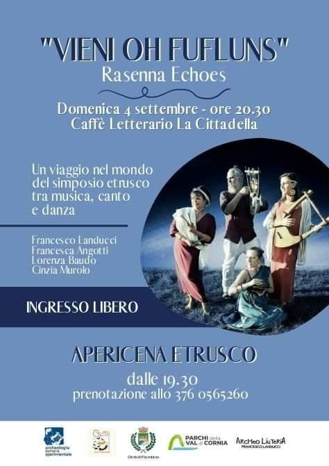 Domenica 4 settembre dalle 19.30 il Caffè Letterario la Cittadella sarà lo sfondo del concerto etrusco “Vieni oh Fufluns” nato dal progetto “Rasenna Echoes”: una serata, organizzata in collaborazione con il Comune di Piombino e la Società Parchi Val di Cornia, dedicata a un storico popolo che ha fatto la storia di Piombino attraverso musiche e cibo a tema. Si partirà alle 19.30 con un apericena etrusco, a 15 euro, al Caffè Letterario per poi proseguire alle 20.30 con il concerto in piazza della Cittadella a ingresso gratuito.