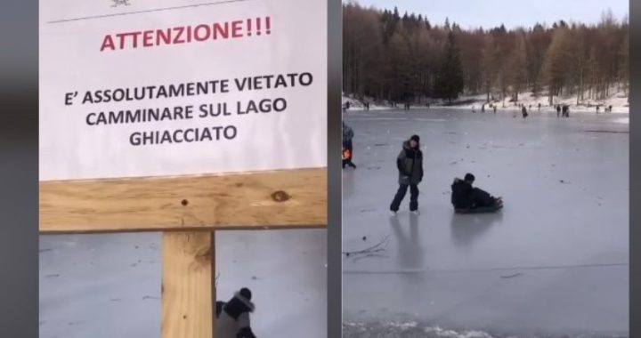 “È assolutamente vietato camminare sul lago ghiacciato” – questo è il messaggio, chiaro e inequivocabile, che campeggia in prossimità di Lago della Ninfa nel comune di Sestola, in provincia di Modena, lungo le pendici del Monte Cimone, eppure molte persone hanno fatto finta di non vederlo o lo hanno volutamente ignorare.