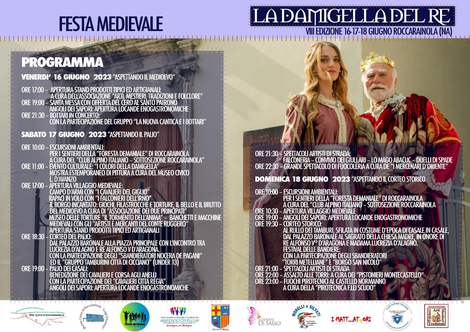 Anche quest’anno si terrà la Damigella del Re, appuntamento giunto alla sua ottava edizione che riporta Roccarainola ai fasti del Medioevo il 16 giugno, il 17 giugno e il 18 giugno 2023. Saranno 3 giorni di feste, canti e balli popolari tra sfilate, prelibate degustazioni, giochi medievali e spettacolari assalti al castello.