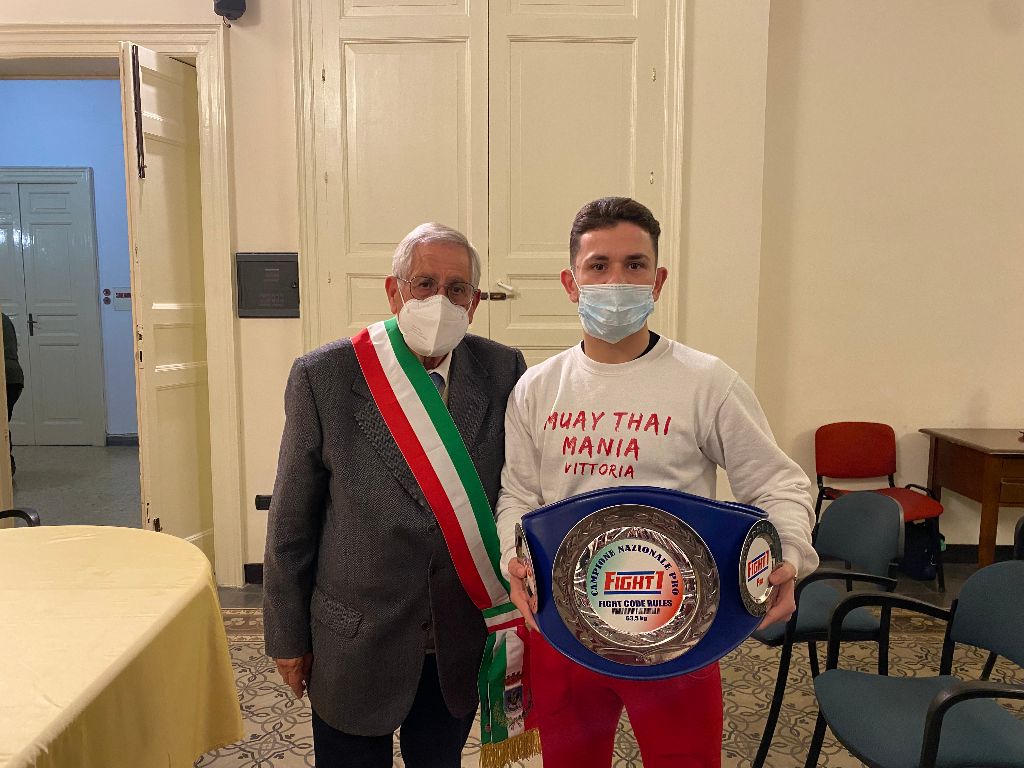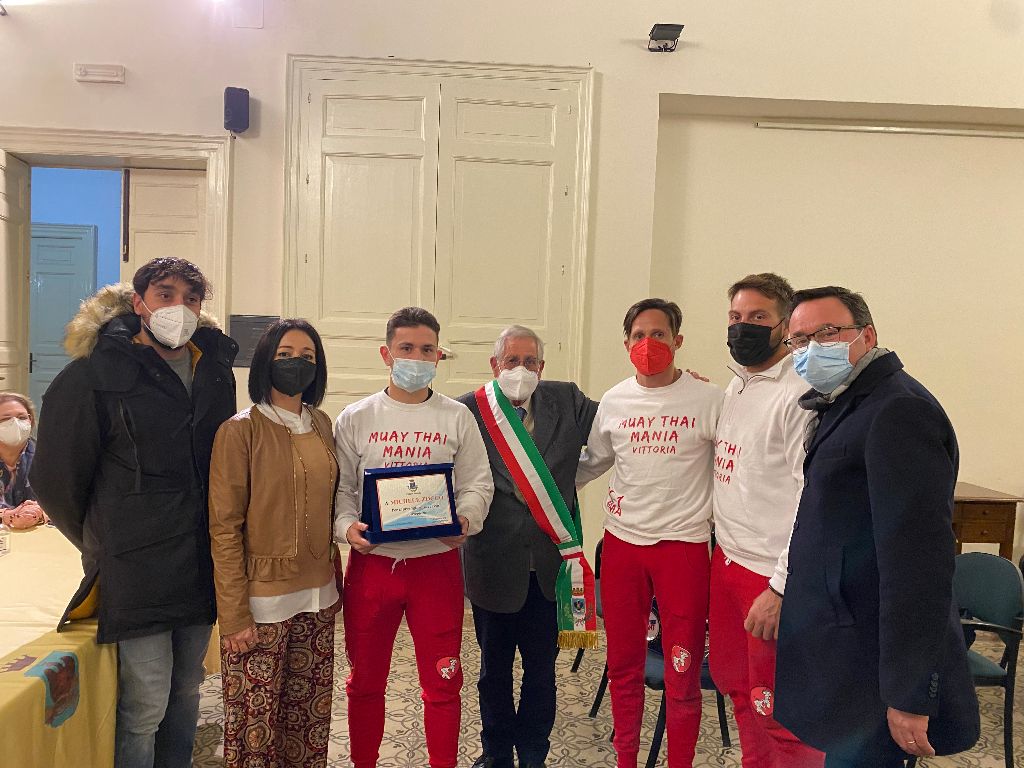 Dopo il successo della palestra Muay Thai Mania di Vittoria che per la seconda volta ha conquistato un titolo italiano di K1, i maestri Luca Cupperi e Rosario Di Pietro insieme agli atleti Michele Zocco e Carmelo Migliorisi, sono stati ricevuti, ieri pomeriggio, dal sindaco di Vittoria Francesco Aiello nella sala Quarto Stato di Palazzo Iacono.