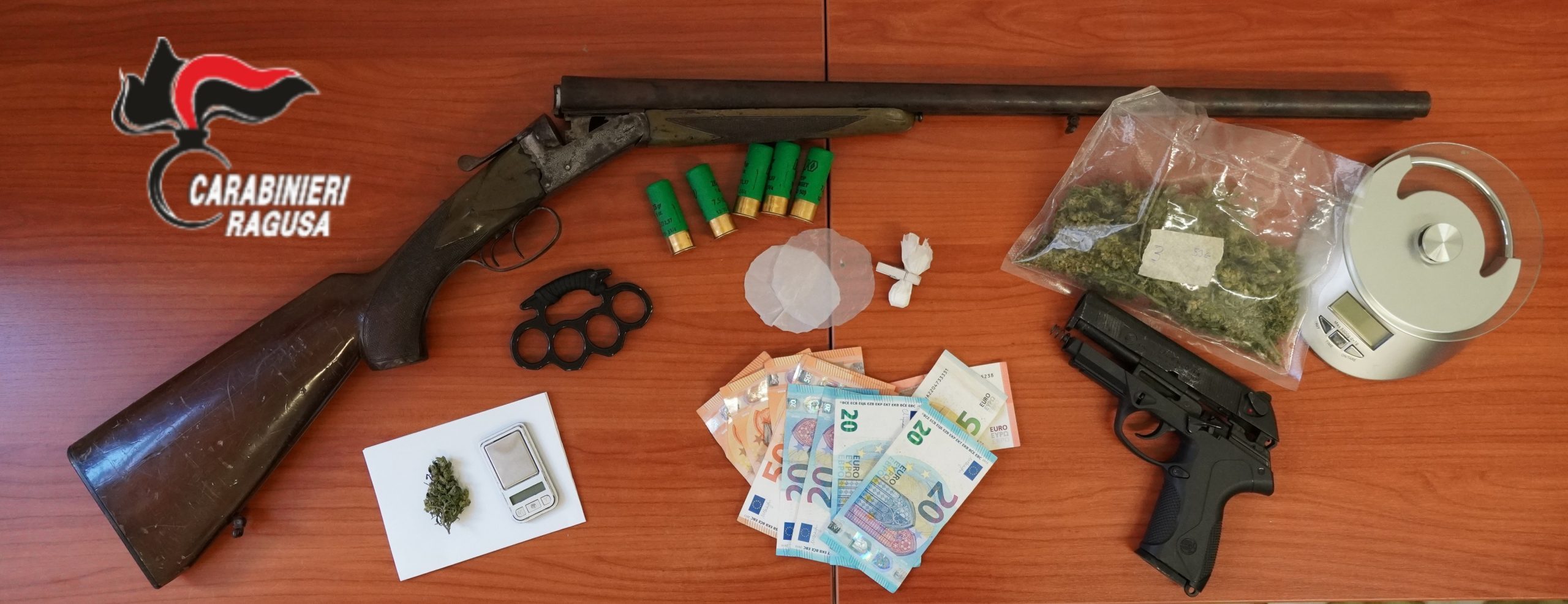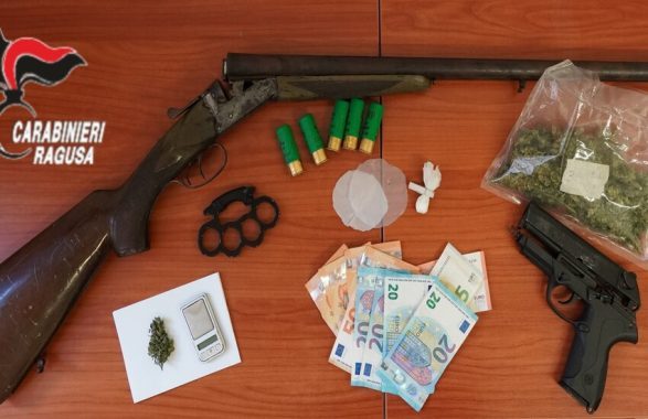 A seguito dell’attività di polizia i Carabinieri, intervenuti con i colleghi del Nucleo Cinofili di Nicolosi (CT) e dello “Squadrone Eliportato Cacciatori di Sicilia” di stanza a Sigonella, hanno rinvenuto, all’interno della residenza perquisita, oltre 40 grammi di Marijuana, alcune dosi di Cocaina ed una serie di strumenti utilizzati per la pesatura ed il confezionamento dello stupefacente in dosi oltre ad una somma di circa 350 €, quale presumibile introito derivante dall’attività di spaccio. La ricerca ha inoltre permesso di trovare, nella disponibilità dei due inquilini, un fucile cal. 12 tipo doppietta da caccia con matricola abrasa e con relativo munizionamento, e una pistola tipo scacciacani priva del tappo rosso. I Carabinieri di Ragusa hanno quindi tratto in arresto i due vittoriesi residenti nell’abitazione, un giovane ventunenne e la sua convivente trentenne, entrambi disoccupati, e sottoposto a sequestro tutto il materiale costituente prova di reato. Il GIP di Ragusa che ha convalidato l’arresto, a conclusione dell’udienza di convalida ha disposto l’applicazione della misura cautelare degli arresti domiciliari per l’uomo e la remissione in libertà per la donna.